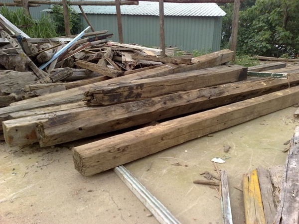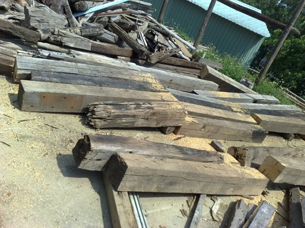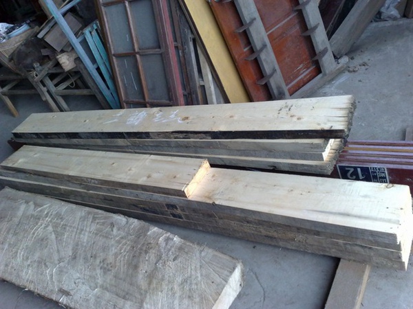 這些松木柱可能是從某舊木材場拆的,應該也有幾十年歷史,八月中旬開始處理。木材寬度約22~24公分,外表十分的舊,有很多裂痕,少部分有火燒的痕跡。請人除完釘子後,送到附近工廠切段,每支2公尺長,總共22支。取10支轉送另一家工廠剖片,每支剖成5片,共50片。處理到此階段的總工資約9千元,工廠處理這些舊料很費時間,收費又不能太高,也覺得有些不划算,但老闆還是用力配合。